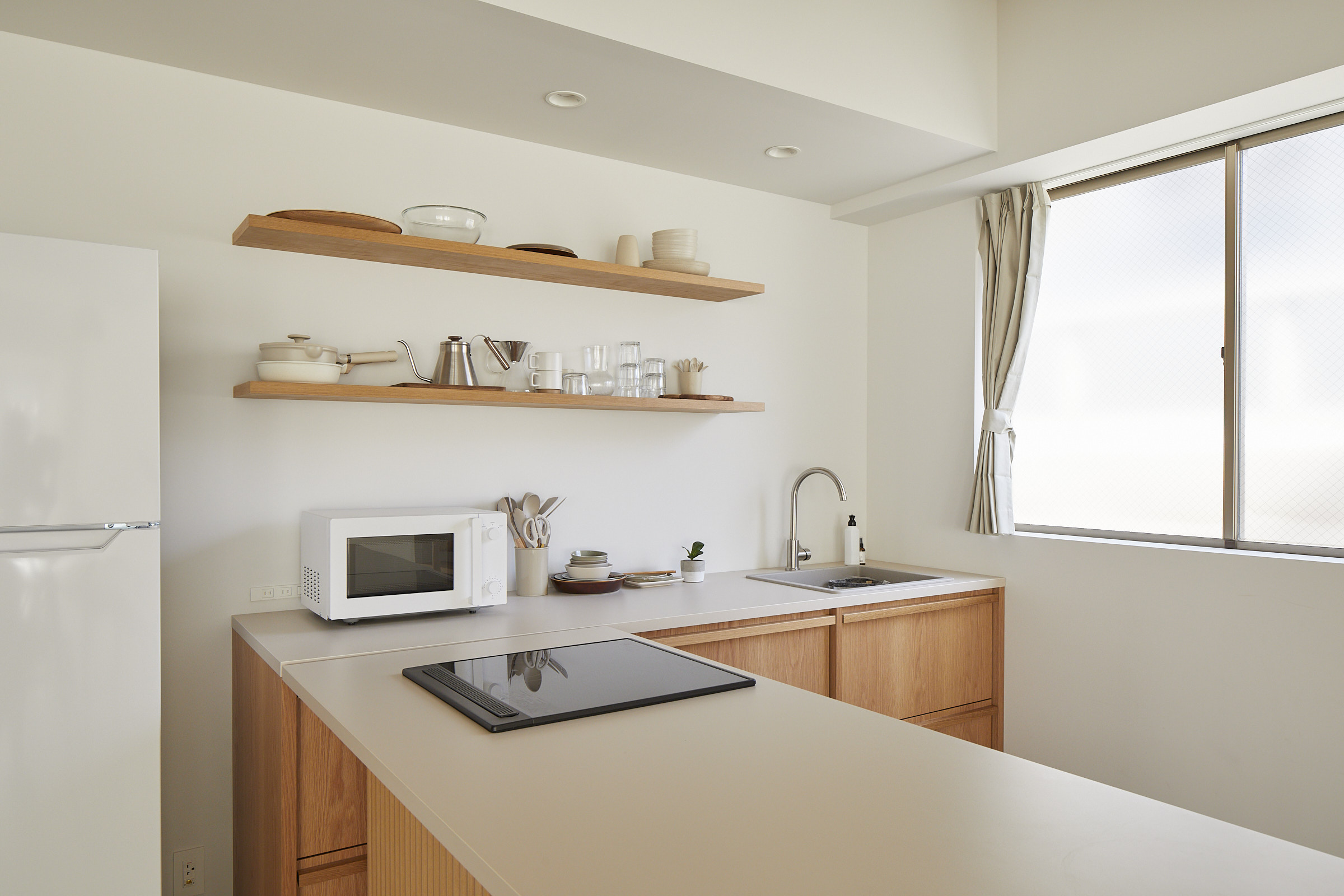 キッチン横の窓外にもベランダがあるのでライティングも可能。アイランドを動かせばコーナーキッチンにも。